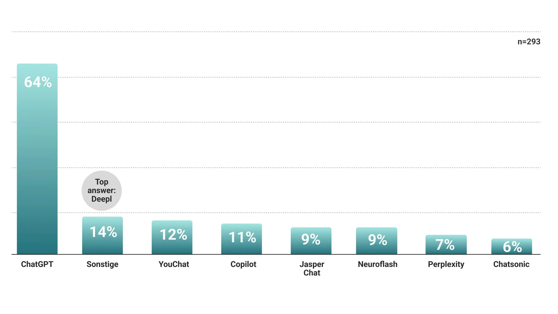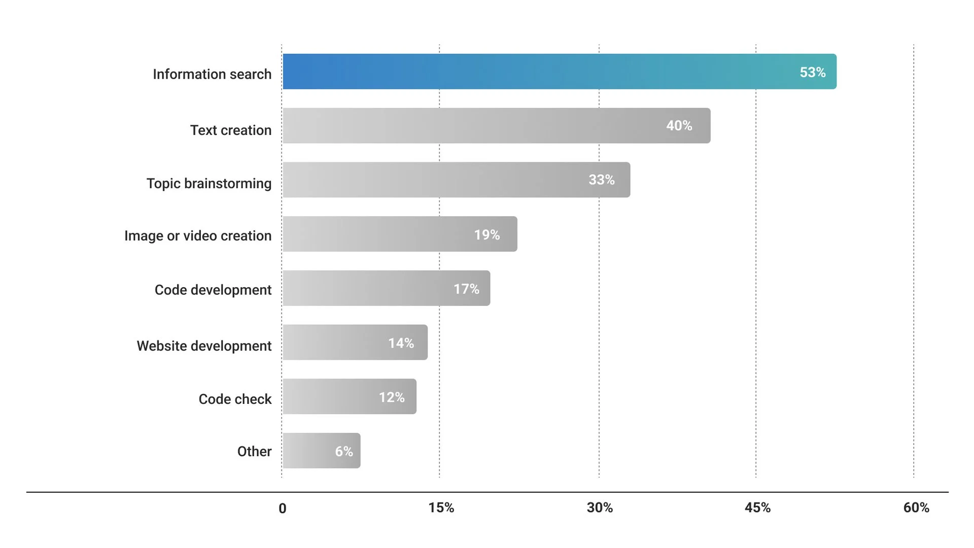 A survey conducted by the freelancer portal Freelancermap in January among 854 freelancers in the German-speaking region revealed the prevalence of AI tools among freelancers. According to the survey, six out of ten respondents actively use AI-based tools. AI is most commonly used for searching for information (53 per cent) and generating text (40 per cent). By far the most widely used tool is ChatGPT, employed by 64 per cent of AI users. The areas that could benefit most from AI tools are development, tech and data, and marketing and communication.
