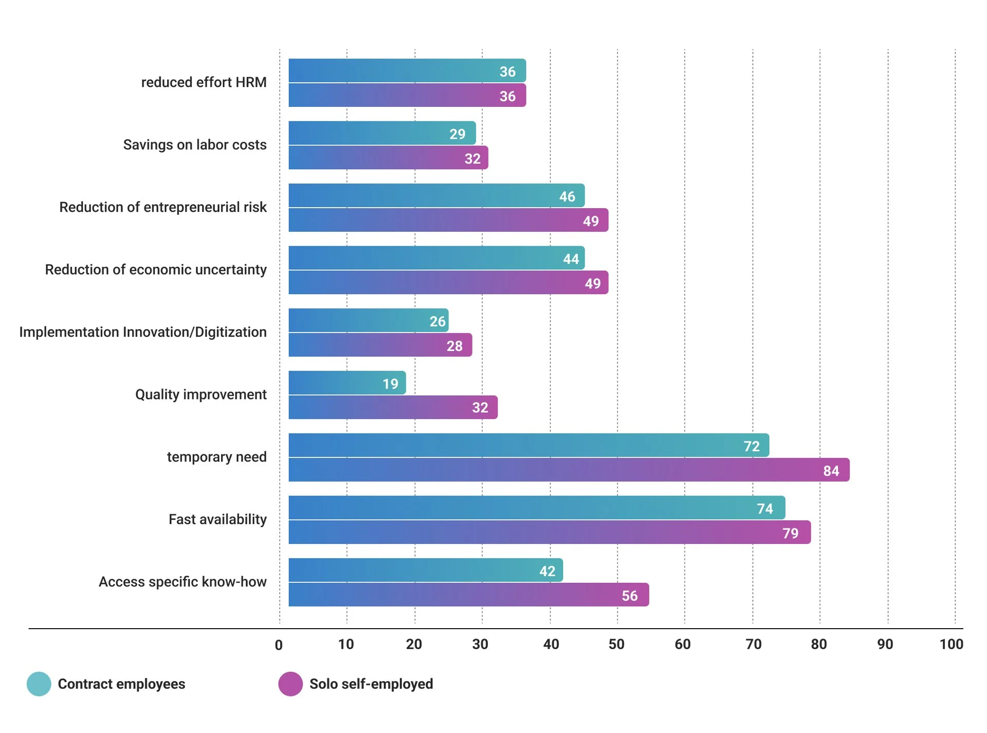 Indeed, in many companies, freelance experts appear to be the driving force behind the adoption of new technologies such as AI. This is demonstrated by a study published by the German Economic Institute (IW) in April. The study surveyed almost 900 companies from the IW panel in spring and summer 2022. 'The use of external personnel is a catalyst for digital transformation at the corporate level,' states the study's summary. This hypothesis is supported by the fact that IT issues are among the most common areas of application. Furthermore, the analyses indicate that freelance workers and solo self-employed individuals play an important role in implementing digital frontier technologies. For instance, 28 per cent of respondents said they use solo self-employed individuals to implement projects in innovation and digitalisation, and 56 per cent expect them to provide access to specific expertise.